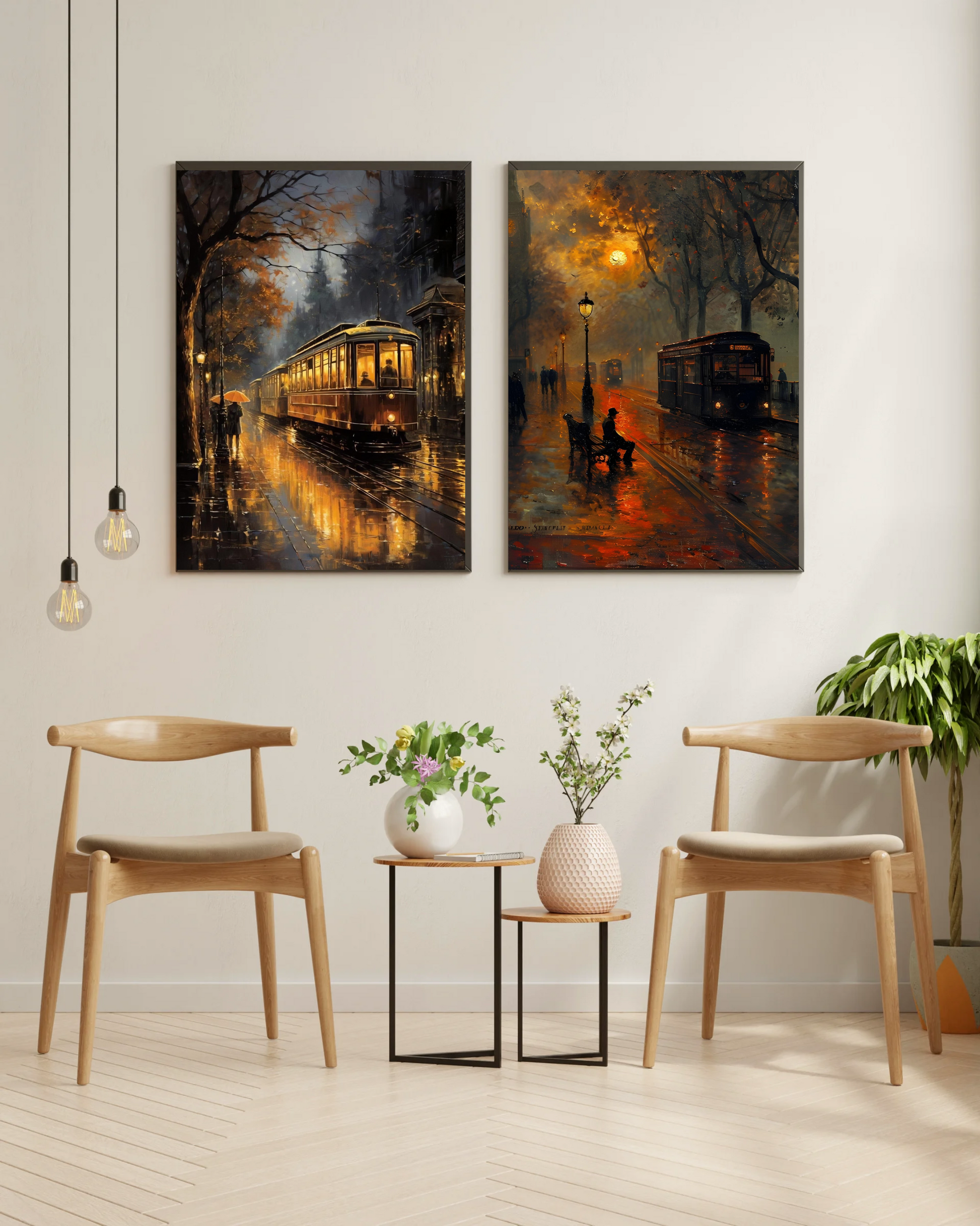 Bask in the warmth of "Golden Hour Echoes," a captivating duo of artworks that transport you to quiet, rain-soaked streets glowing under autumn skies. Each piece tells a story of stillness and solitude — where golden reflections meet wandering souls beneath bare trees and vintage streetlamps. Perfect for those who appreciate atmospheric cityscapes rich in light, texture, and emotion.