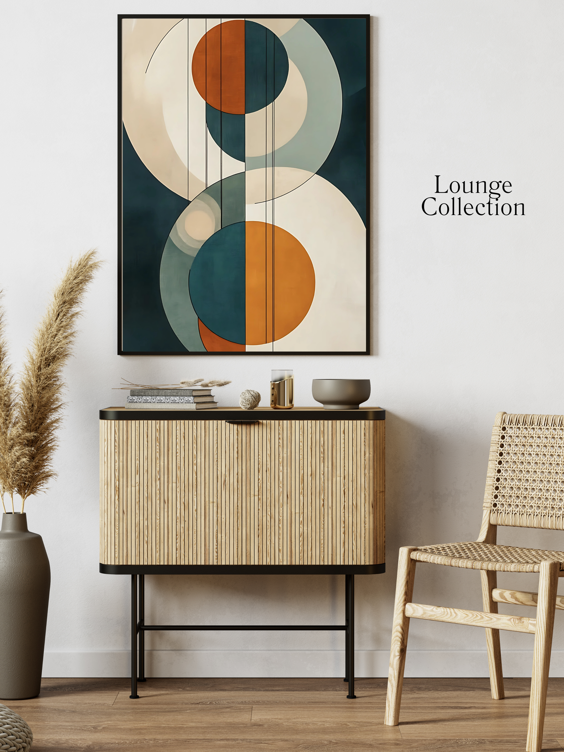 "Chromatic Symmetry" explores the striking balance of shape and color through bold geometric patterns. The first piece fuses sweeping curves with structured blocks of color, creating a harmonious blend of earth tones and deep contrasts. The second artwork emphasizes the elegance of circles and arcs, set against a backdrop of cool blues and warm oranges, all intersected by fine linear details. Together, these pieces invite a conversation of perfect balance, making them a standout addition to any modern space.