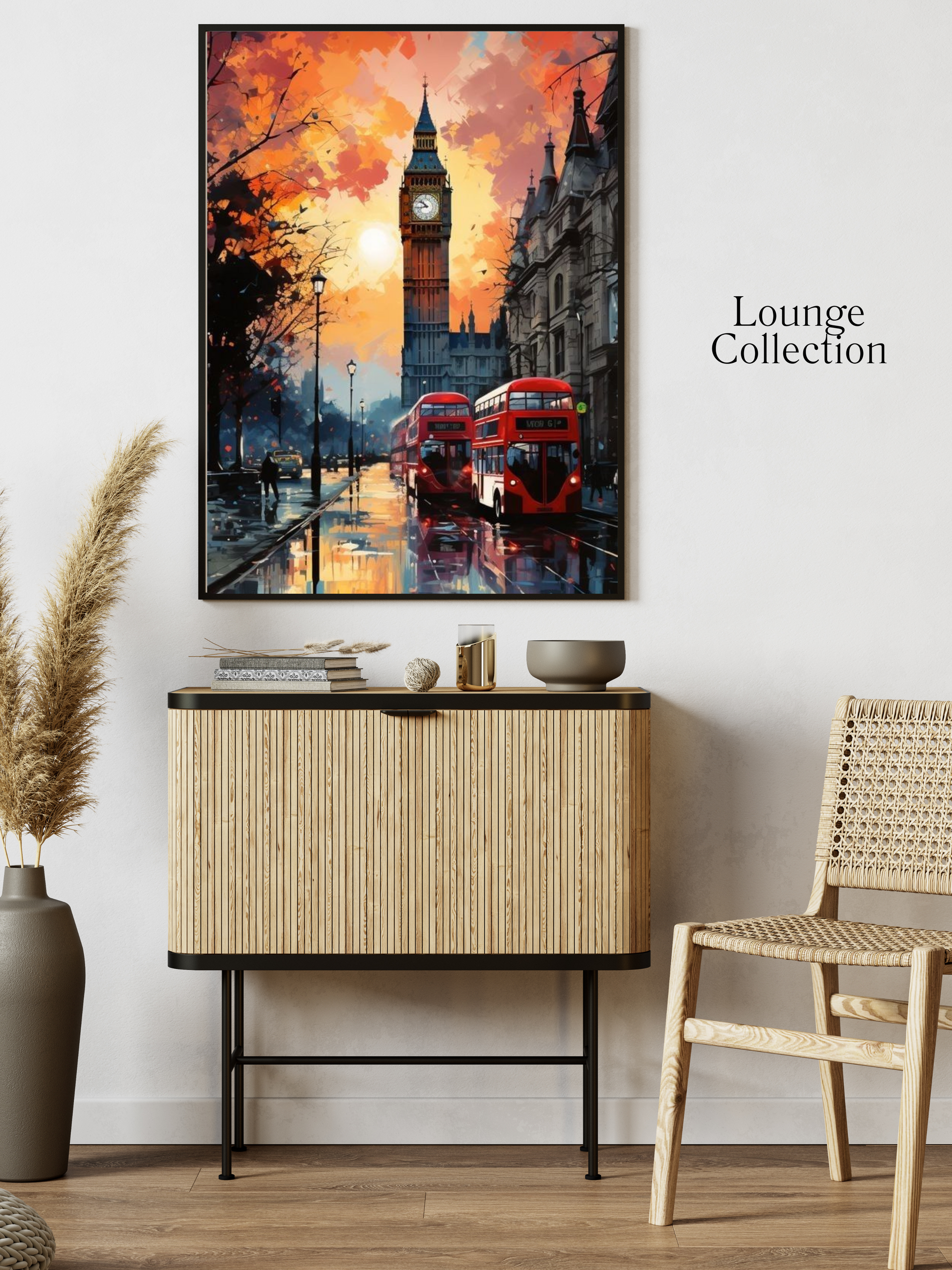 "London Dusk" beautifully captures the iconic charm of London at sunset, where the vivid hues of orange and pink fill the sky, reflecting off the rain-soaked streets below. The towering Big Ben stands tall against the cityscape, while the famous red double-decker buses add a lively touch to the scene. The intricate details of the buildings and the soft glow of street lamps further bring this iconic moment to life, offering a striking image that transports viewers to the heart of London’s timeless beauty. Perfect for anyone seeking to bring a touch of urban elegance and nostalgia to their space.