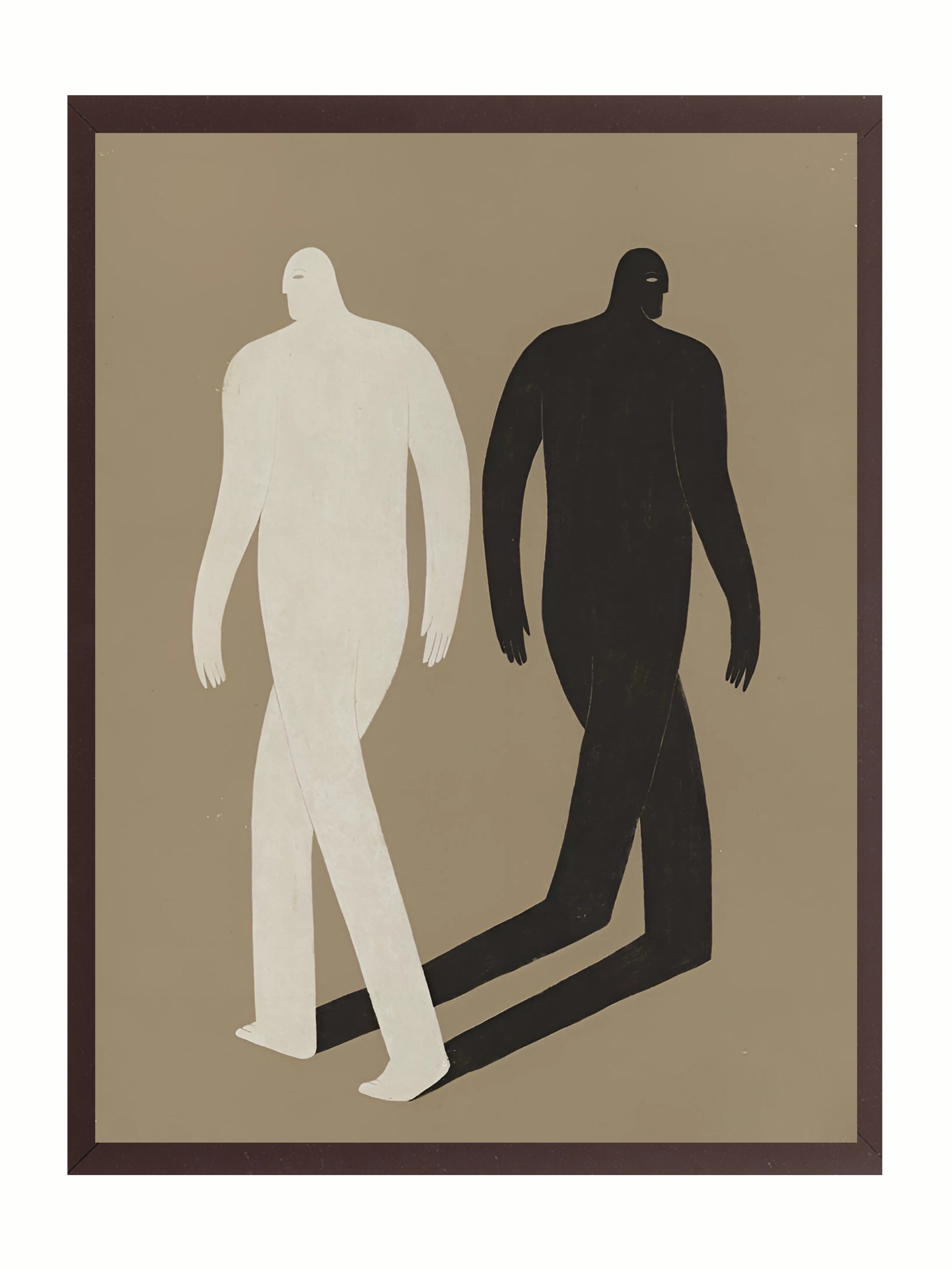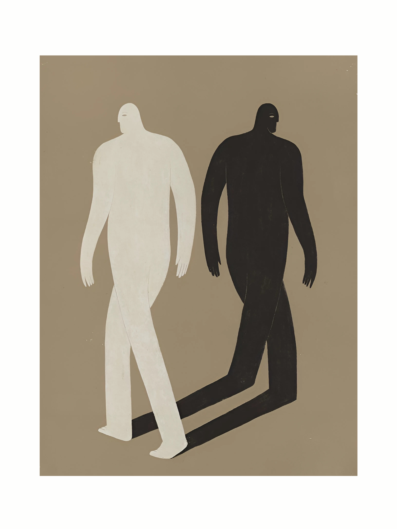 "Fragmented Reflections" captures the interplay of light and shadow, form and void. The first piece deconstructs the human body into geometric fragments, evoking a sense of self-exploration and the fragmented nature of identity. The second piece contrasts two minimalist figures—one light and one dark—symbolizing balance and duality. Together, these works create a powerful narrative of contrasting forces, offering a bold and thought-provoking statement for any modern space. Perfect for those who appreciate art that challenges perception and embraces the complexities of human existence.