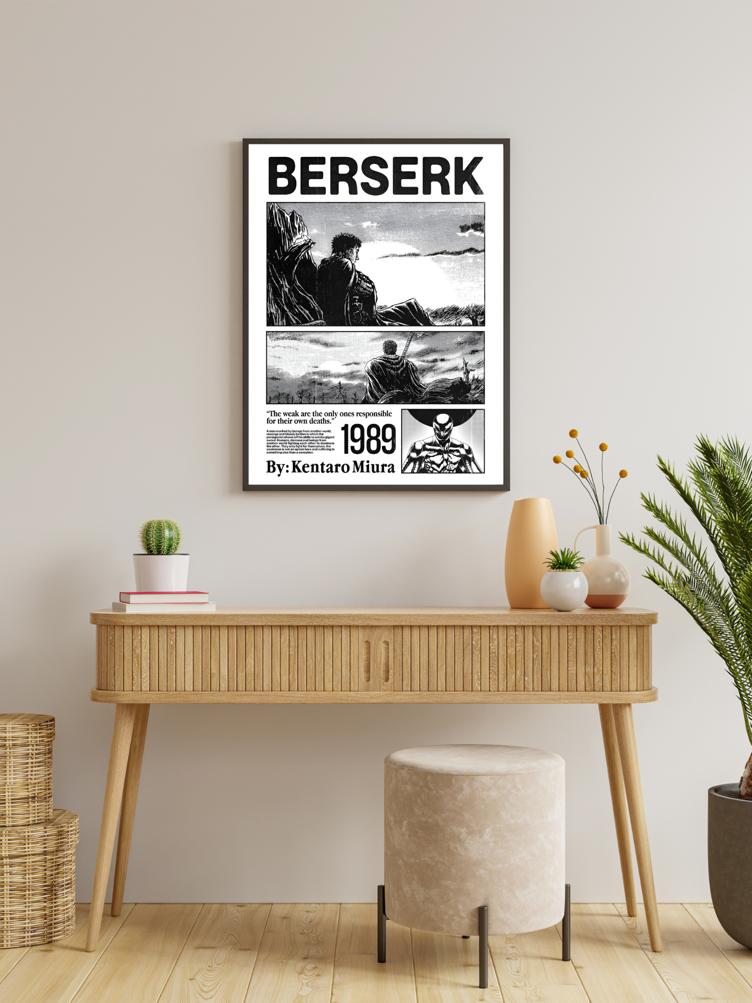 This exclusive Velvetone three-frame bundle unites the tragic worlds of Berserk and Demon Slayer in a bold, newspaper-style art collection. Each frame is styled like a front-page relic from a fallen world — complete with grunge textures, dramatic headlines, and black-and-white illustrations accented with deep reds and faded ink.