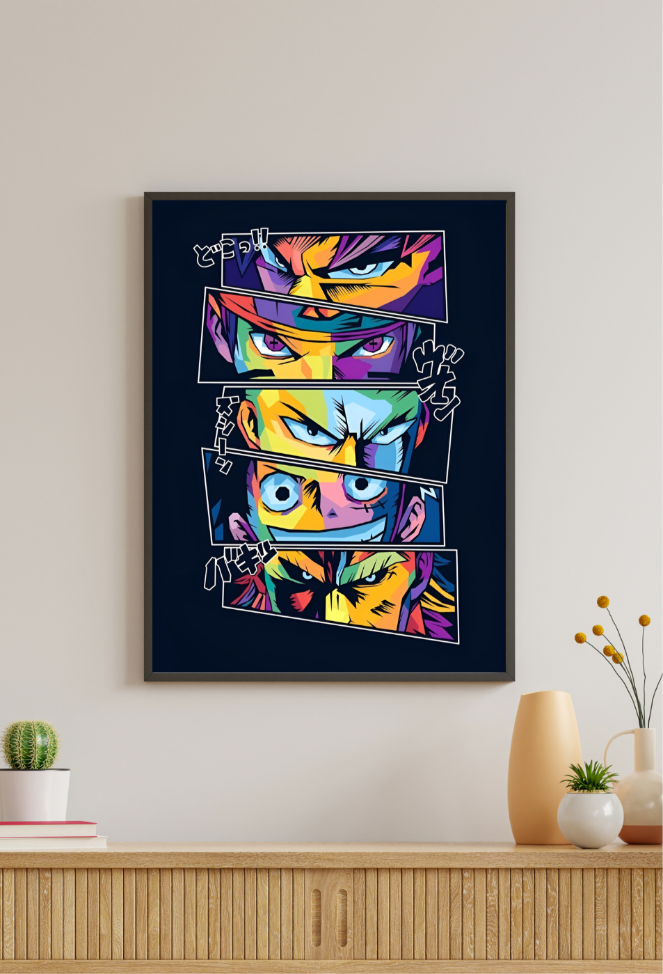 This explosive framed poster captures the raw intensity of anime’s fiercest moments — with five bold, stylized character panels locked in mid-action glare. Rendered in vivid neon tones and comic-style slicing, each frame bursts with attitude, energy, and unmistakable Shonen spirit.