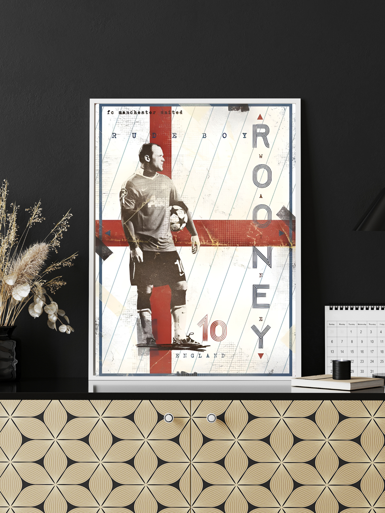 This framed poster pays tribute to Wayne Rooney, the fierce and fearless forward who defined a generation of English football. From his explosive debut with Everton, to his legendary years at Manchester United, to becoming England’s all-time top scorer, this piece captures Rooney in full force — charging, striking, or roaring in celebration.